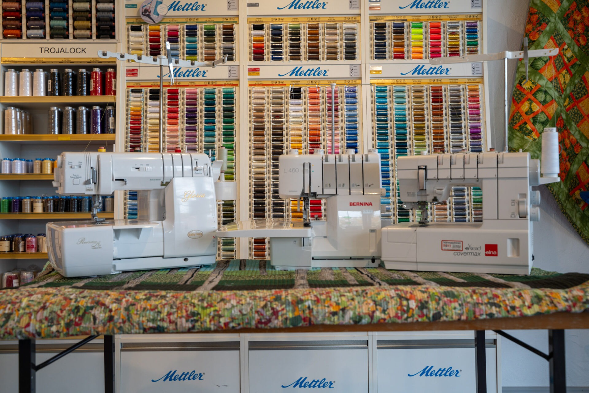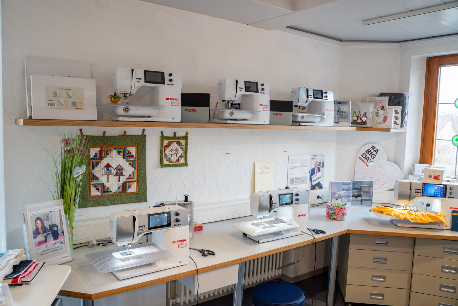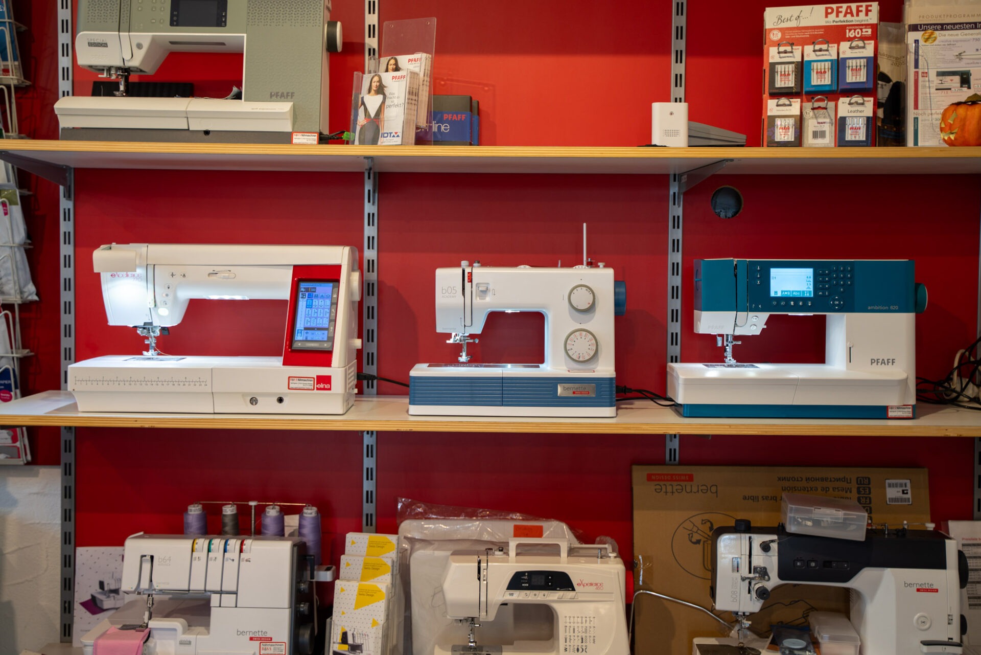 Das ist unser Geschäft in Wahlwies. Wir haben Verkaufsräume für Nähmaschinen und Zubehör sowie separate Räume für unsere regelmäßigen Nähkurse. Außerdem befindet sich im selben Gebäude unsere hauseigene Werkstatt.